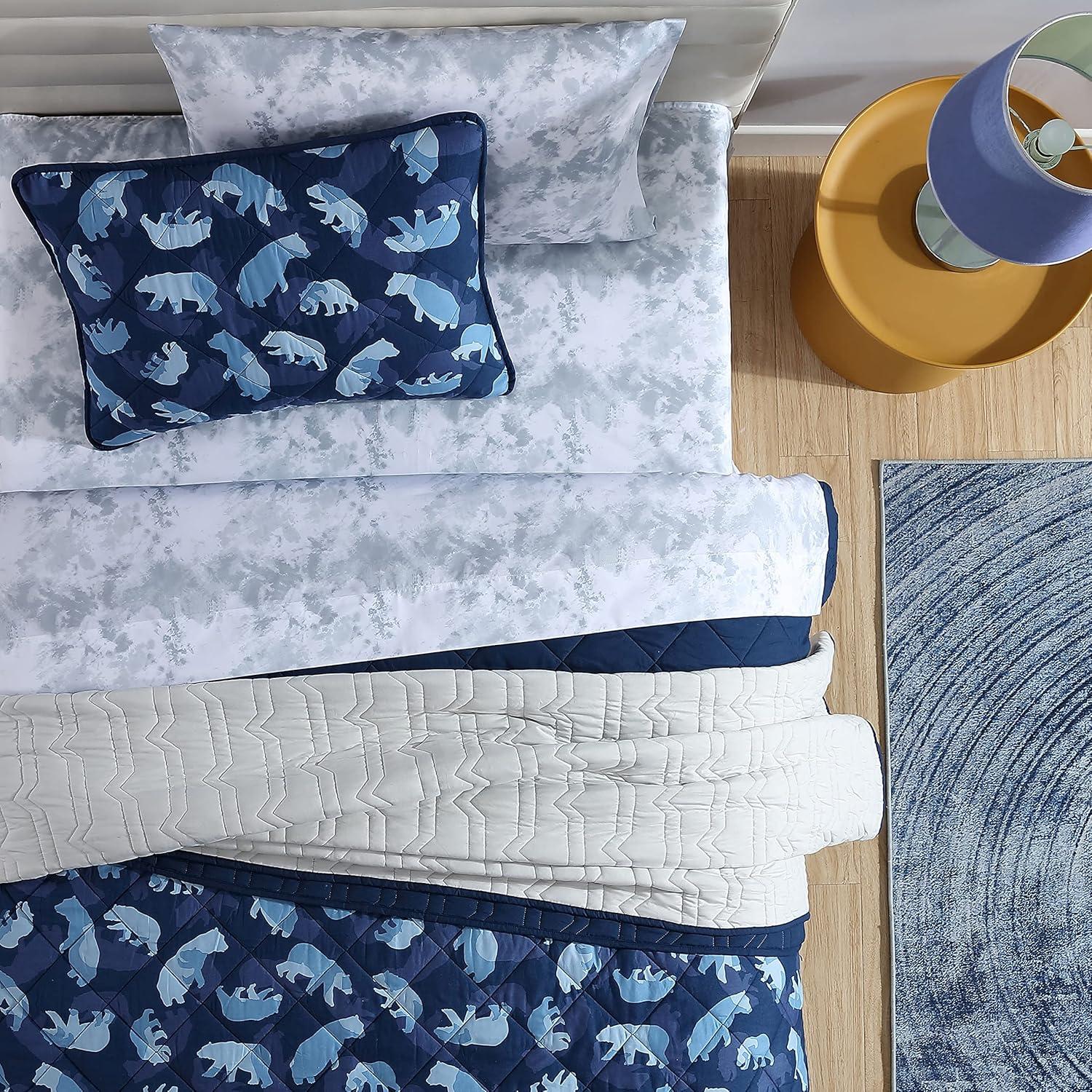 Eddie Bauer - Twin Quilt Set, Naturally Soft Cotton Bedding w/a Lightweight Feel for All-Year Comfort, Reversible w/Matching Pillowcase, 2 Piece Bed Set (Moose Plaid/Pinstripe/Patchwork Blue)(Camp Camo Navy)